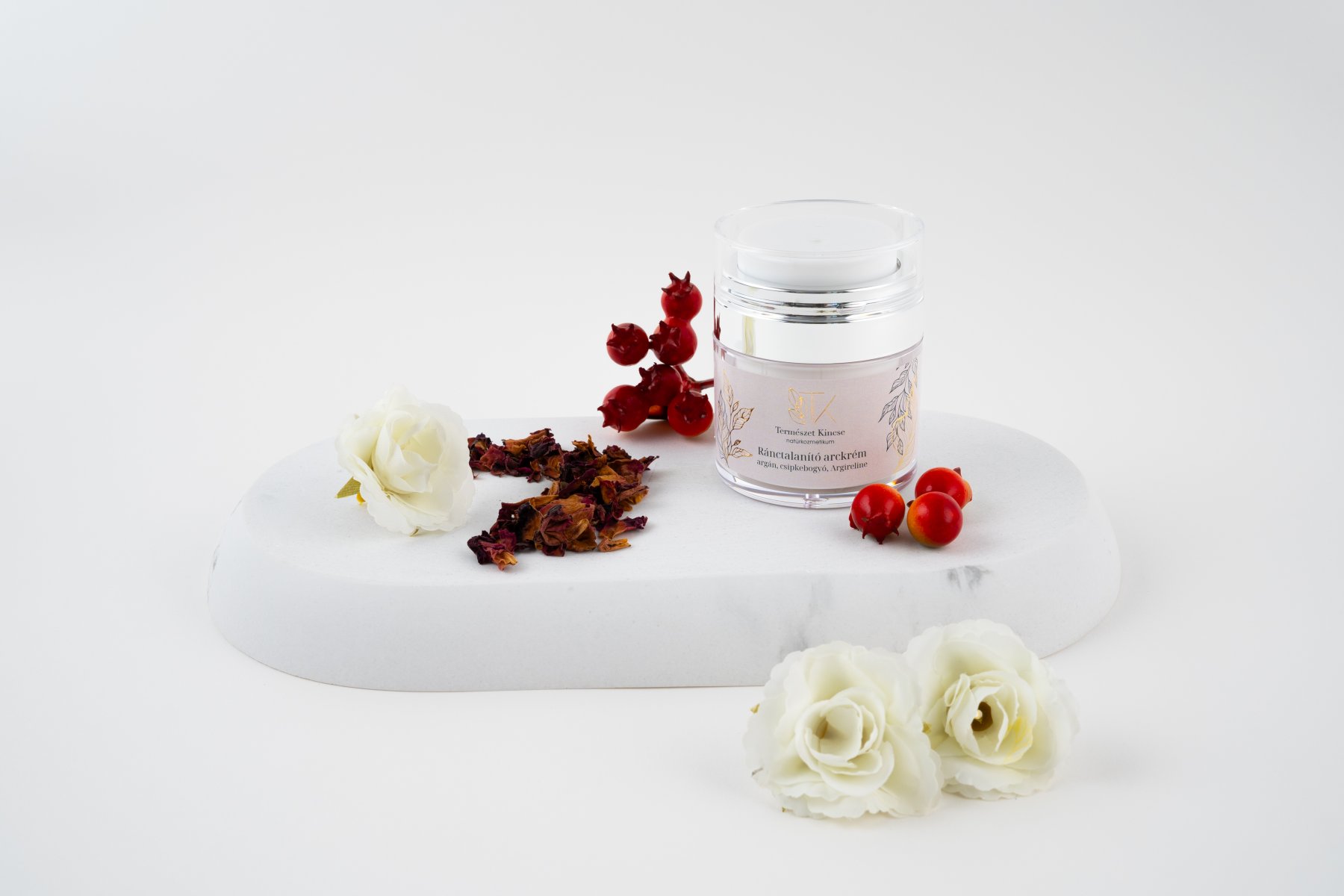 Ránctalanító arckrém, amely argán-, csipkebogyó- és Argireline kivonatot tartalmaz, többféle jótékony hatással rendelkezik az összetevői alapján: